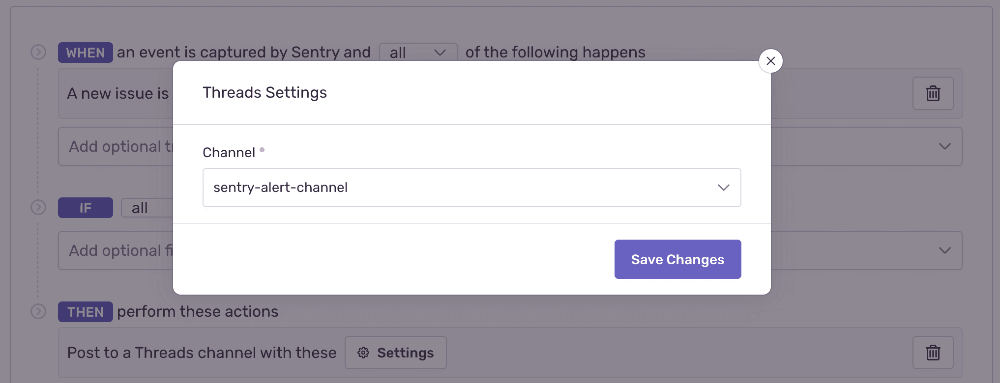 The Threads Sentry integration allows you to configure Threads as a destination for issue and metric alerts. Threads will keep you updated on the status of the Sentry issue, and let you know when a metric alert has been triggered and resolved.